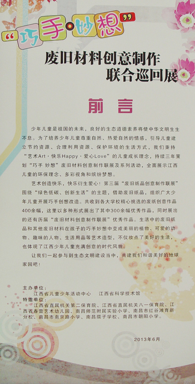 最新公告 发布时间:2013/5/30 14:21:13 访问量:为庆祝“六一”儿童节,由江西省妇女联合会、江西省科学技术厅指导,江西省儿童少年活动中心、江西省科学技术馆主办的“纸艺创想·巧手改造·美好未来” 废旧材料创意制作联展将于2013年6月1日开始在江西省科技馆展出。 联展倡导“绿色低碳、创新生活”理念,培养少儿创意思维发展,使少年儿童亲近自然、爱护环境。家长和孩子可在现场变废为宝,参与“奇妙纸箱城,美好未来梦”体验活动,搭建一座美丽的城堡。 联展还将于2013年6月17日—10月,走进各幼儿园、学校巡回展出。 期待您的“巧手”、“妙想”,欢迎加入我们! 江西省科学技术馆 二〇一三年五月三十日