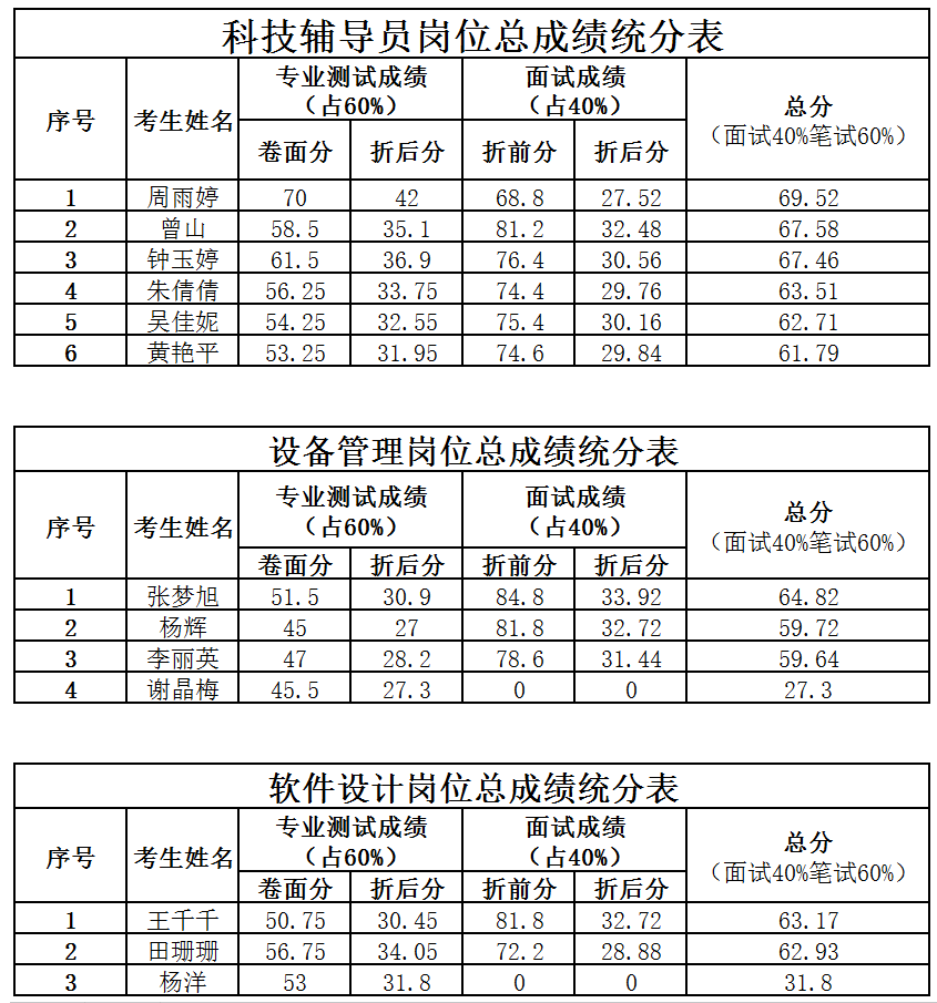 最新公告 发布时间:2017/1/16 11:36:08 访问量:根据《关于事业单位公开招聘人员工作有关事项的通知》(赣人字〔2009〕43号)、《关于印发〈江西省事业单位公开招聘人员实施办法(试行)的通知〉》(赣人发〔2006〕7号)及《江西省科学技术馆2016年公开招聘高层次工作人员公告》。现将科技辅导员岗位、设备管理岗位和软件设计岗位笔试、面试成绩向社会予以公示。公示期间,如有问题,请及时反映。