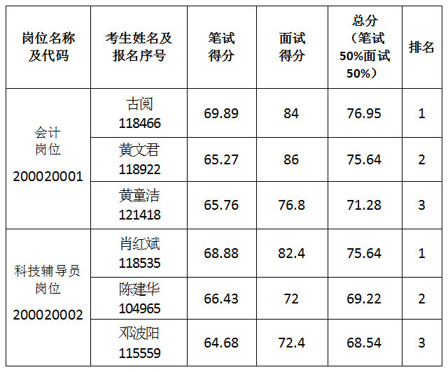 最新公告 发布时间:2018/1/5 10:28:42 访问量:根据《江西省2017年下半年省直事业单位招聘公告》有关规定,省科技馆公开招聘工作人员2名。经笔试、面试,现将入闱面试考生总成绩及排名公布如下: