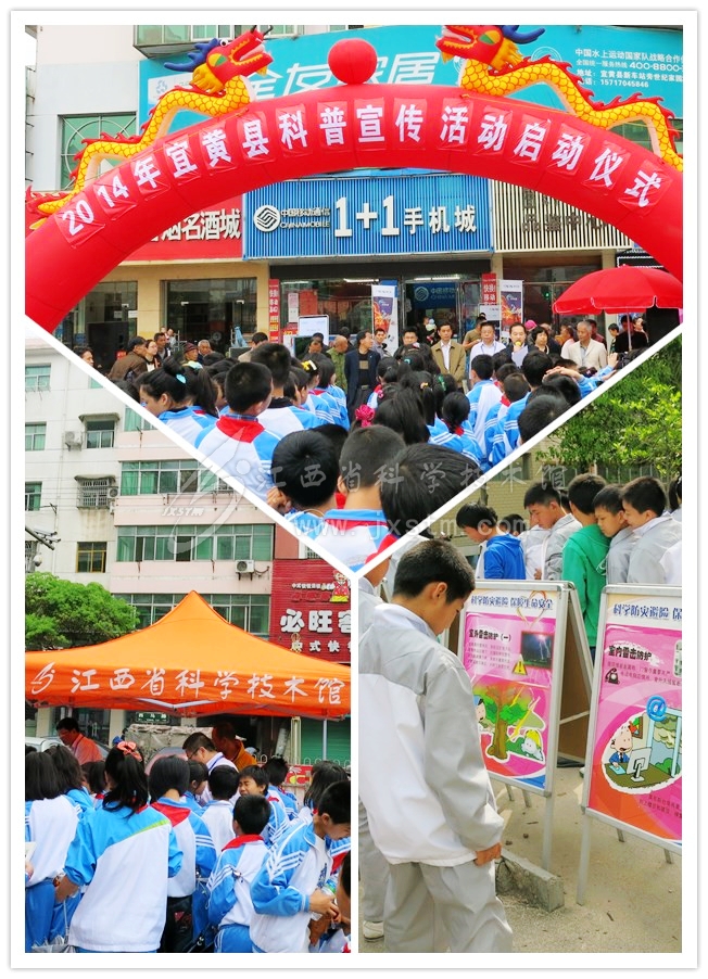 4月13日,2014年宜黄县科普活动启动仪式在宜黄县汽车站广场举办。活动现场气氛热烈,30多件科普大篷车车载展品组成科技互动体验区,“铿锵锣鼓、激光竖琴、消防闯关、锥体上滚”等涉及声、电、光、磁、数学方面原理的科普展品让人大开眼界,大家在亲手操作中体验了科普展品。50多块“科学防灾避险、保障生命安全”以及“科学低碳、绿色发展”图文版组成的主题科普展览分布四周,吸引大家驻足观看。活动现场还提供了有关科技政策及知识产权等内容的咨询服务,同时派发了500多份科普书籍及科技馆宣传册。近千人参加了本次科普活动。
