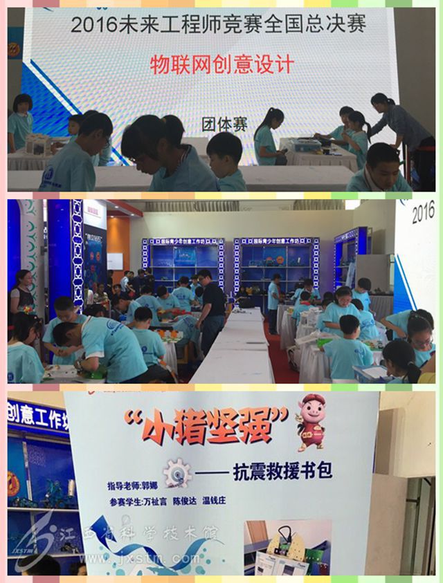 我馆动态 发布时间:2016/6/14 16:40:29 访问量: 2016年5月全国科技周活动期间,第十一届全国青少年未来工程师博览与竞赛总决赛在北京民族文化宫拉开帷幕。经过物联网创意设计大赛地区选拔赛的角逐,我馆比特实验室三位学生成功晋级总决赛,并以自主设计的“小猪坚强——抗震救援书包”赢得一等奖。这是我馆首次组织学员参与大赛,并从全国40个优秀团体中脱颖而出获得该奖项。