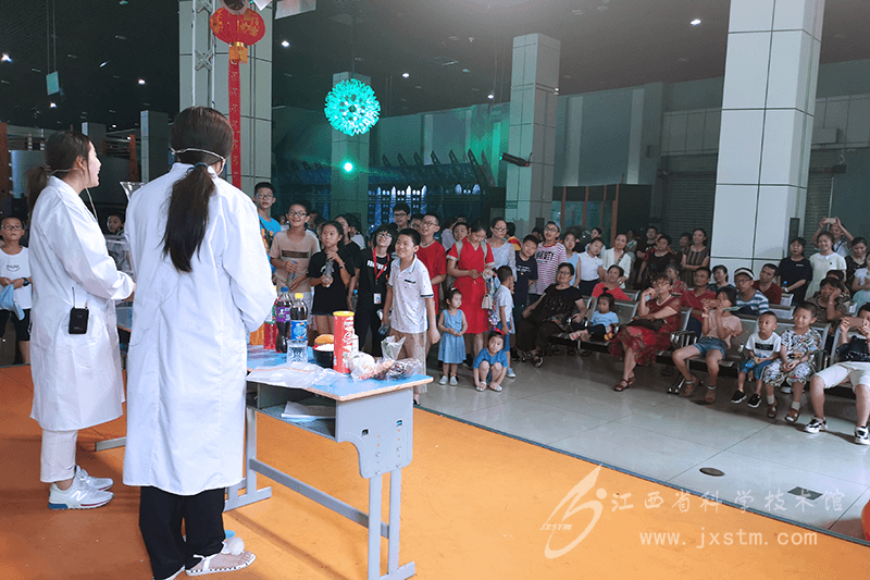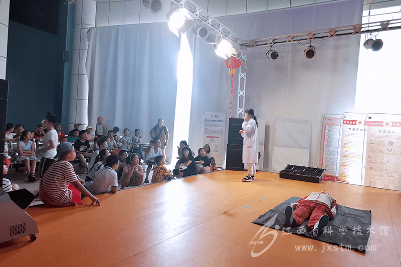 由滕王阁社区组织的60余名学生及家长,观看了《食品搭配禁忌》的实验,以及专题科学活动《溺水急救知识》。