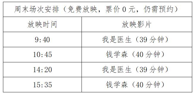 1、活动期间每周周末将在3D巨幕影院上映新片《钱学森》和《我是医生》,免费面向广大观众预约观看,放映场次如下: