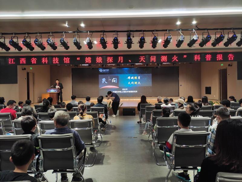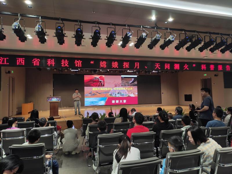 本次活动分为科普报告与集体观影两部分内容。邀请了国家杰出青年科学基金获得者、中国科学院上海技术物理研究所研究员、博士生导师何志平现场授课,报告深入浅出地介绍了我国“探月测火”工程的发展历程、开发现状、以及研究目标,揭示了如何探寻“宜居星球”关乎人类未来的重大意义,描绘了“星辰大海没有尽头、科学探索永不止步”的人类空间科技的愿景。在后续观众提问的互动环节,会场交流的气氛传递出公众对天文科普的喜爱与认可。