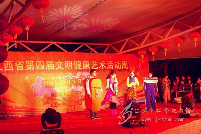 由江西省文明办和江西省人民广播电台共同主办的江西省第四届文明健康艺术活动周于2010年10月15日晚在南昌八一公园拉开帷幕。江西省科技馆代表省科技厅分别于10月19日和10月21日表演了科普剧《家电夜话》和独唱《美丽家园》。 省科技馆选送的独唱《美丽家园》热情洋溢,表达了… -